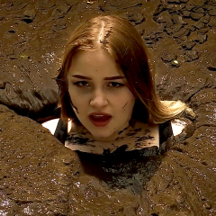 One time, I went on a safari to see all the wild animals of Western Washington. Things were great until all of the sudden, I looked around, and I was all alone--I had gotten separated from the group. I was lost! Our video begins with me walking across a vast, barren land searching for sounds of the safari group. I'm wearing white cut-off jean shorts, a midriff-baring short sleeve tan button up safari shirt, unbuttoned to expose my cleavage and brown bra, and a jungle safari hat. I walk and walk until I see an entrance back into the forest, but I have to cross a large area of mud to get there. I take a couple of tentative steps, but before I know what's happening, I sink deep into the earth--first one leg, then the other. I squirm and struggle to free myself, but everything I do seems to make me sink deeper into the mud. But this isn't any normal mud--it's quicksand! I struggle and strain, moaning and grunting loudly. I find a lifeline of a wooden plank to use to pull myself out. I almost manage to get out, but I sink right back down again; my clothes must be weighing me down! So, I remove my shirt and bra, exposing my bare breasts. I lose the hat as well. I struggle and strain some more, but I just continue to sink slowly until it looks like the mud will swallow me whole. I sink under, and, unfortunately, at that point my friend Sinkubus's battery died and he didn't bring a backup! You don't get to see me emerge, so at the end, I've included a little flashback to me above the mud, struggling not to sink. We did, however, manage to snap a couple of shots with my phone. Unsurprisingly, I was a complete mess, with mud covering every inch of me--in my eyes, in my ears, up my nose, and I'm pretty sure I ate some. I've included those pics in a zip file of pics for you to enjoy.